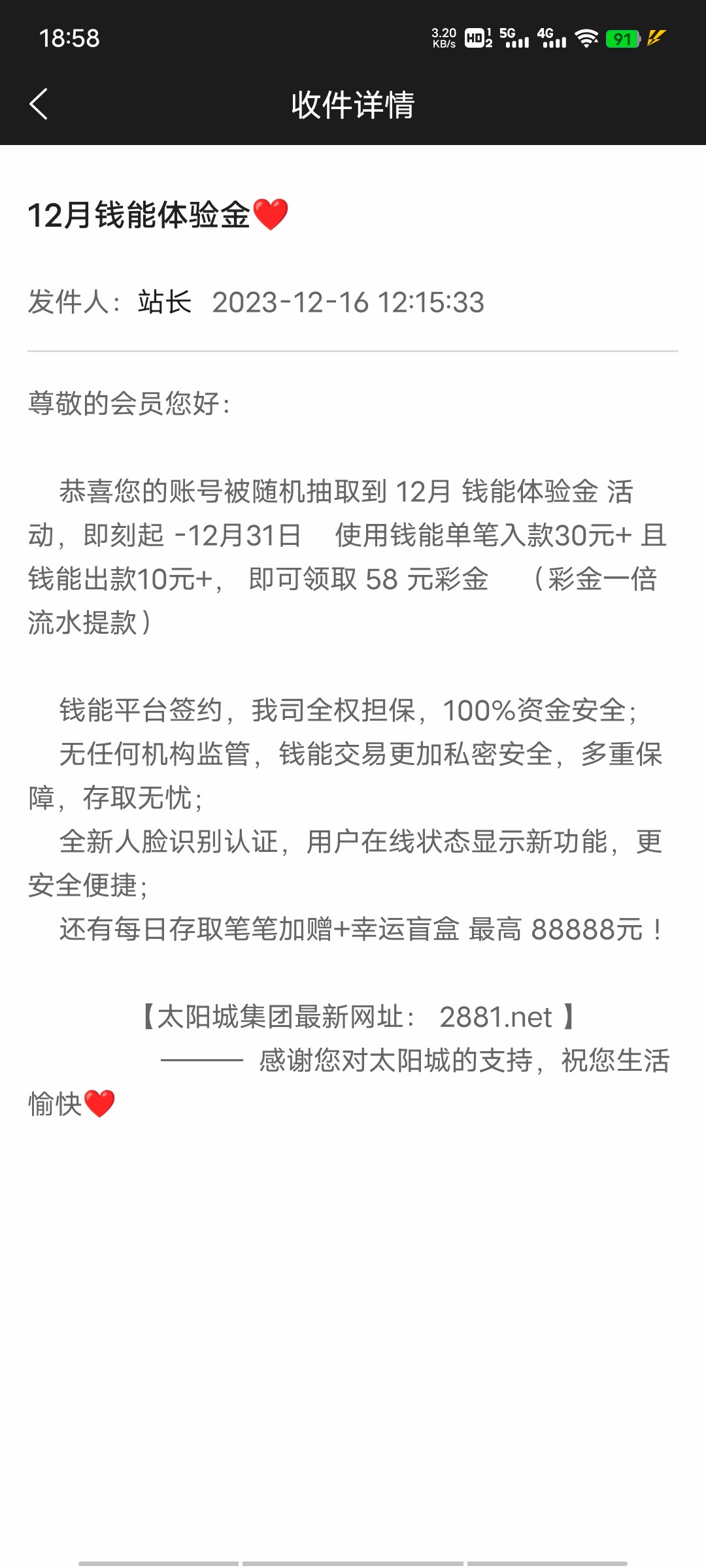 2018太阳城,看站内信,送58