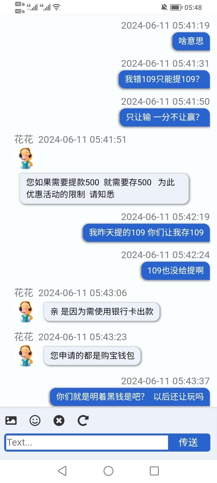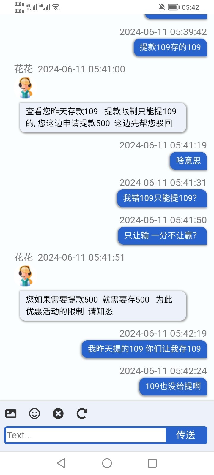 打电话送18 提款109 不让提 说让充109才能提 充值以后还是不让提 又让提供手持身份证 提供了也不让提又说只能提银行卡 银行卡最低500提 打到500也不让提 说我存款109只能提109 畜牲 合着我只能输一分不能赢