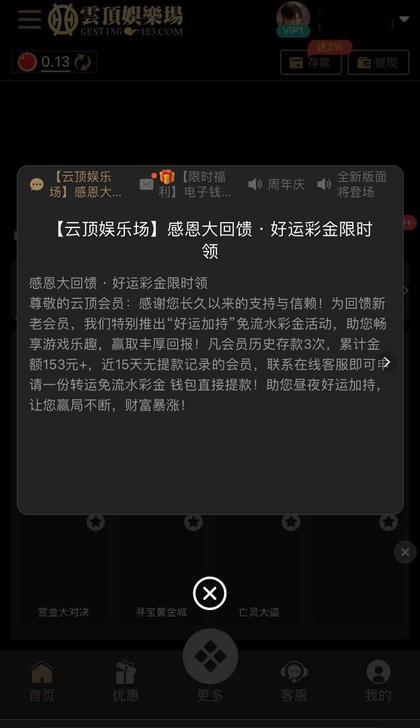 历史存款3次,累计金额153元+,近15天无提款记录的会员,联系在线客服即可中请一份转运免流水彩金