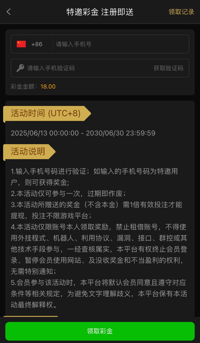 特邀碰瓷注册好在优惠里自助领取,一倍流水,没有游戏限制