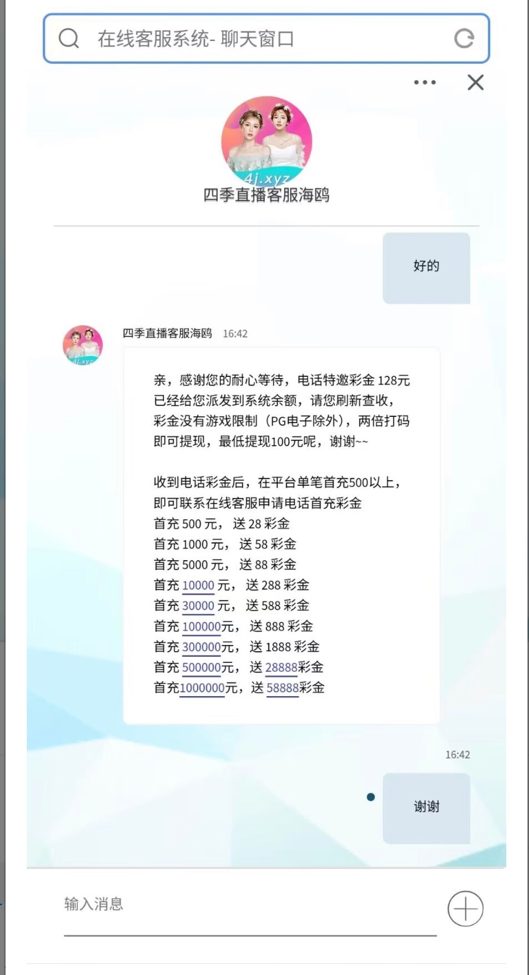 碰瓷特邀,新用户下载APP发手机号客服查询看看是不是特邀秒送128/2倍流水100提,没碰到的无视,彩金不能玩PG,其他都可以,链接打不开的找客服拿下载地址。
