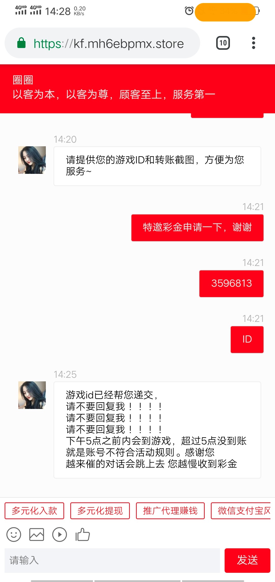 说充值没到账秒回复,他妈的哈哈哈